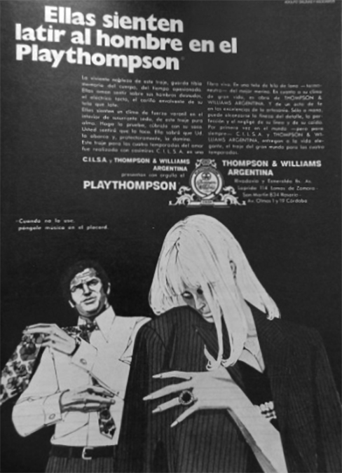 El macho viril dominante, protector, envolvente se publicitaba: “Ellas sienten latir al hombre en el Playthompson”, imponía el anuncio de una publicidad de trajes masculinos que se presentaban como aptos “para las cuatro temporadas del amor” (Gente Nº217, 1969:23). La ilustración mostraba a una mujer blonda de largas uñas con el saco de un varón sobre sus hombros: “Ellas aman sentir sobre sus hombros desnudos, el eléctrico tacto, el cariño envolvente de su tela que late. Ellas sienten un clima de fuerza varonil en el interior de susurrante seda, de este traje pura alma. Haga la prueba, cúbrala con su saco. Usted sentirá que la toca. Ella sabrá que Ud. la abarca y, protectoramente, la domina” (Gente Nº217, 1969:23).