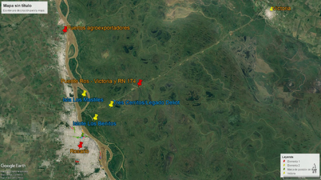 Imagen 1: mapa del área ampliada donde se visualiza la ubicación de las reservas entre el Gran Rosario (Santa Fe), el Municipio de Victoria (Entre Ríos) y las infraestructuras principales: la hidrovía a lo largo del Río Paraná, los principales puertos de granos y oleaginosas y el Puente Rosario Victoria/ Ruta Nacional 174.