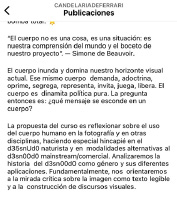 Este artículo explora la circulación de fotografía artística del cuerpo en medios digitales y sus vínculos con la acción política feminista argentina post 2015, a partir de la difusión online de fotografías realizadas con perspectiva de género por las artistas Ana Harff, Candelaria Deferrari Piccione, Nadia Bautista e Irini Iliopulu (2016-2023).