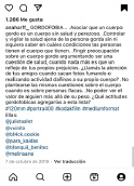 De manera similar a lo visto con Harff, en las figuras 9 y 10 observamos que los textos de Iliopulu y de Bautista buscan orientar el sentido de la imagen que se publica. En el caso del posteo de Iliopulu, se trata de una fotografía de mitad de un torso donde un seno está semicubierto por una pieza de lencería y los brazos estirados de la persona dejan ver el vello de su axila. El vello corporal también conforma parte del repertorio de temáticas del movimiento feminista: esta característica biológica del cuerpo está validada socialmente en los varones mientras en las mujeres se considera un aspecto “no bello” que históricamente ha sido eliminado a través de técnicas de depilación. La artista cuestiona el precepto que une género-vello corporal, refiriendo que “las mujeres tenemos pelos”. Por último, en el posteo de Bautista la fotografía de una mujer desnuda detrás de una “pared de nylon” es acompañada de un texto sobre el cuerpo como construcción social y por tanto objeto de lucha colectiva para la igualdad.