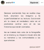 La figura 7 se trata de un posteo en formato texto sobre el rol político y social de la fotografía y el impacto de las fotos en un espacio como lo son las redes sociales, donde abundan las imágenes. De esta manera, la artista destaca la importancia del contenido mismo de aquello que se crea, desde un sentido de responsabilidad social.