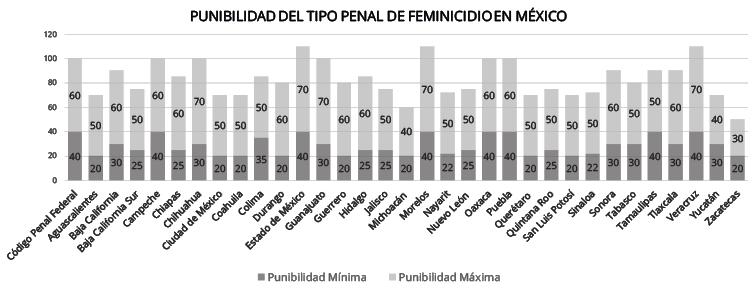 En este tenor, resulta relevante diferenciar el reproche social que existe entre el homicidio y el feminicidio. Pero nos encontramos con que, de los 32 códigos penales vigentes en las entidades mexicanas, sólo 8 de éstos cuentan con una punibilidad diferenciada entre el tipo penal de feminicidio y homicidio calificado; mientras que las 24 entidades restantes establecen igual o similar punibilidad entre ambos delitos, lo que invisibiliza el bien jurídico consagrado en el feminicidio, fomentando la violencia sistemática y las relaciones de poder que violentan el derecho de las mujeres a vivir una vida libre de violencia.