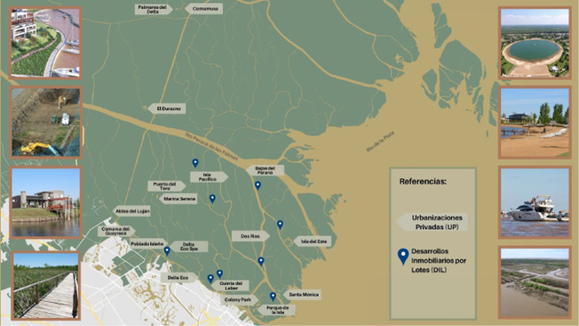 Los desarrollos inmobiliarios y turísticos para altos ingresos, y un entramado de reservas naturales (particulares y estatales), son las modalidades que constituyen el diseño territorial dominante en el BDRP, y han desplegado a gran escala la privatización de la zona más frágil de este sistema de humedales. Las empresas desarrolladoras de urbanizaciones cerradas náuticas imponen mega-obras en islas a partir del “hecho consumado” y del acceso ilegal a los bienes naturales, careciendo de títulos perfectos o de la totalidad de las autorizaciones requeridas.